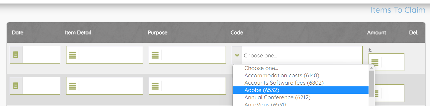 Add in the line items of your claim. For each item you need to complete each box including the relevant claim code. If unsure, ask finance@safefamilies.uk