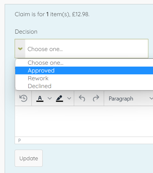 Once you've opened the request, scroll to the bottom and you'll see summary information about the claim. To make your decision, pick one of the options from the drop down list, enter any comments as appropriate and press Update