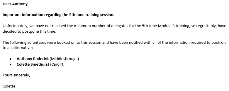 Volunteer Training Update - CVT/Facilitator Cancellation Email June 02, 2023 09:39 Updated Sent 3 days before the scheduled training event, if the required number of delegates has not been achieved.