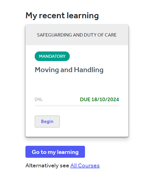 You will be assigned the 'Moving and Handling' module and it will appear in the 'My Learning' section once you have logged on. Select 'begin' to start the module. It is designed to take no longer than one hour. You have the option to sit and listen to the slides or, if you prefer, you can turn off the sound and read the information at your own pace - clicking through when completed. At the end of the course there will be a short 'test'. This is multiple choice. Once completed please upload your certificate to 'my training log' on the staff database. More details about this can be found here.