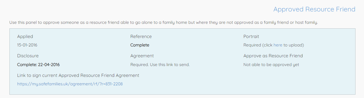 For the portrait, you may do a full volunteer portrait (and will need to if they intend to be a family friend or host in the future) but can also do a lighter portrait. Click the link from the approval panel and you'll find the proforma and a space to upload it.