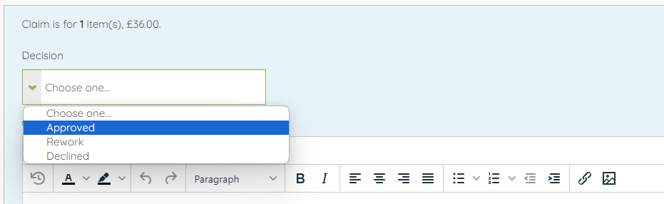 Once you've opened the request, read through the request and then scroll to the bottom to see summary information about the claim. To make your decision, pick one of the options from the drop down list, enter any comments as appropriate and press Update.