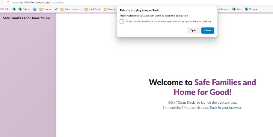 Slack will open in the browser. Tick the box to "Always allow..." and then click Open to open the app.