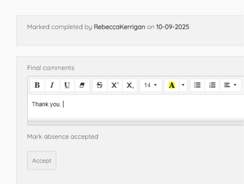 Once marked as complete, the absence record will be sent to the returned staff member with the return-to-work answers and conclusions for them to accept.