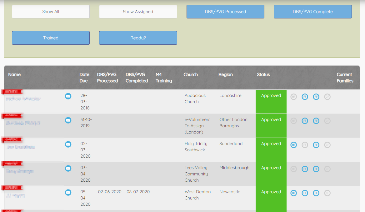 The Pending Recertification view will list all those volunteers within 180 days of certification expiring or overdue. You’ll see their name, church, area, what roles they hold and which (if any) families they’re currently assigned to. You’ll also see their due date and what steps they’ve currently completed towards their recertification.