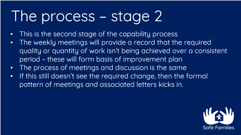 Capabilities and Performance process always starts with a focus on support as we have a desire for all our staff to thrive within their roles. If you have any concerns about a staff members performance these should be discussed with your line manager and / or the People and Culture Team. Below is the outline of the process: